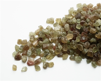 Lyse pastel farvede granat krystaller fra Central Afrika. De har en fin glansfuld overflade af naturlige facetter. Farven spænder fra grøn over i gul og orange. Et parti på 50 carat består af ca. 40 stk.